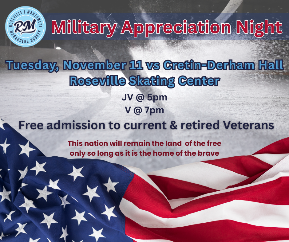 Join us next Tuesday, November 11th, for our Military Appreciation Night! Come out to the rink to cheer on our HS Girls and help us honor our community's service members.